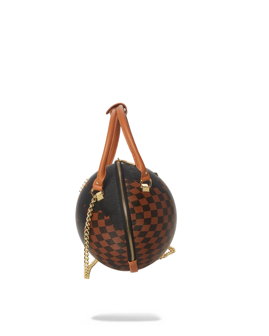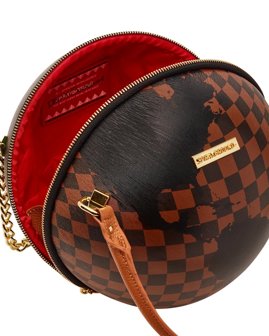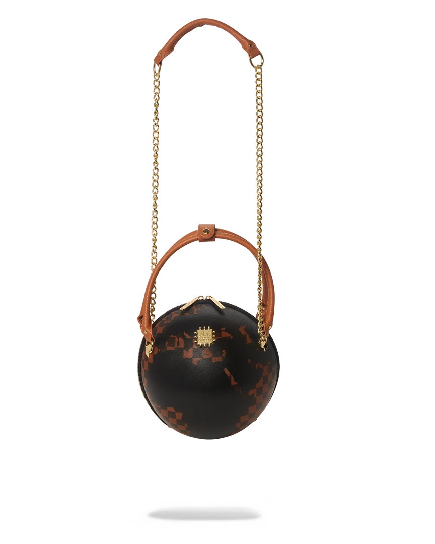 Whimsical sphere-shaped shoulder bag features sharks in Paris map printed in saffiano fabric with contrast cognac pebble fabric