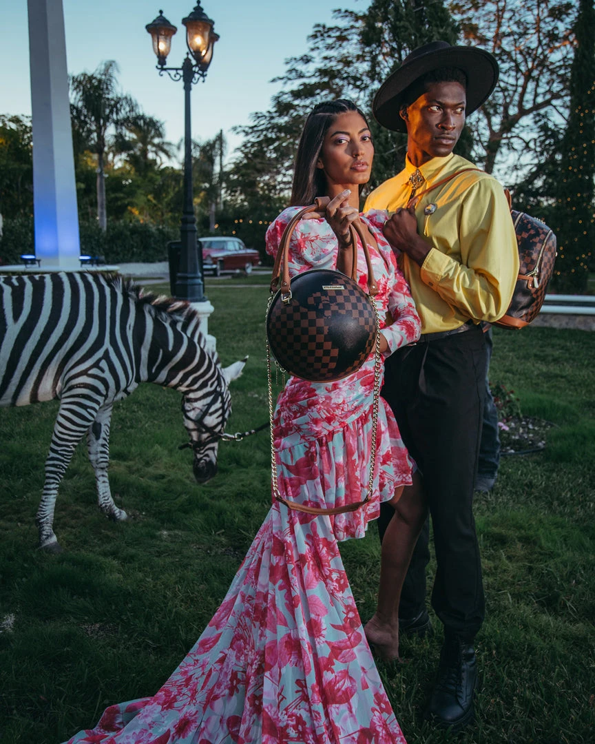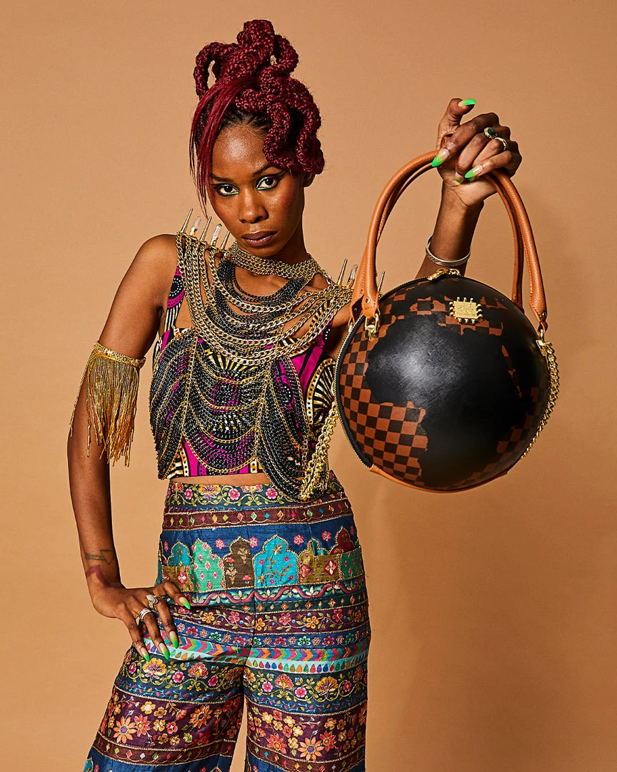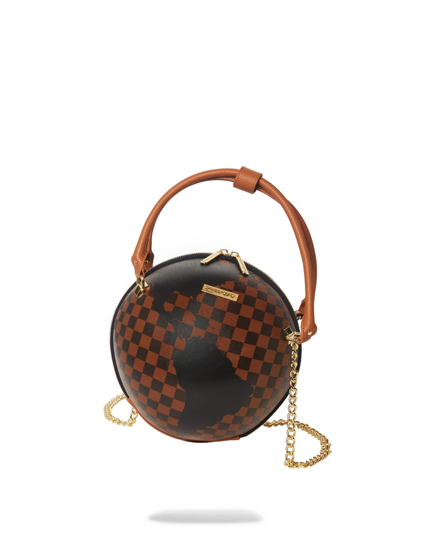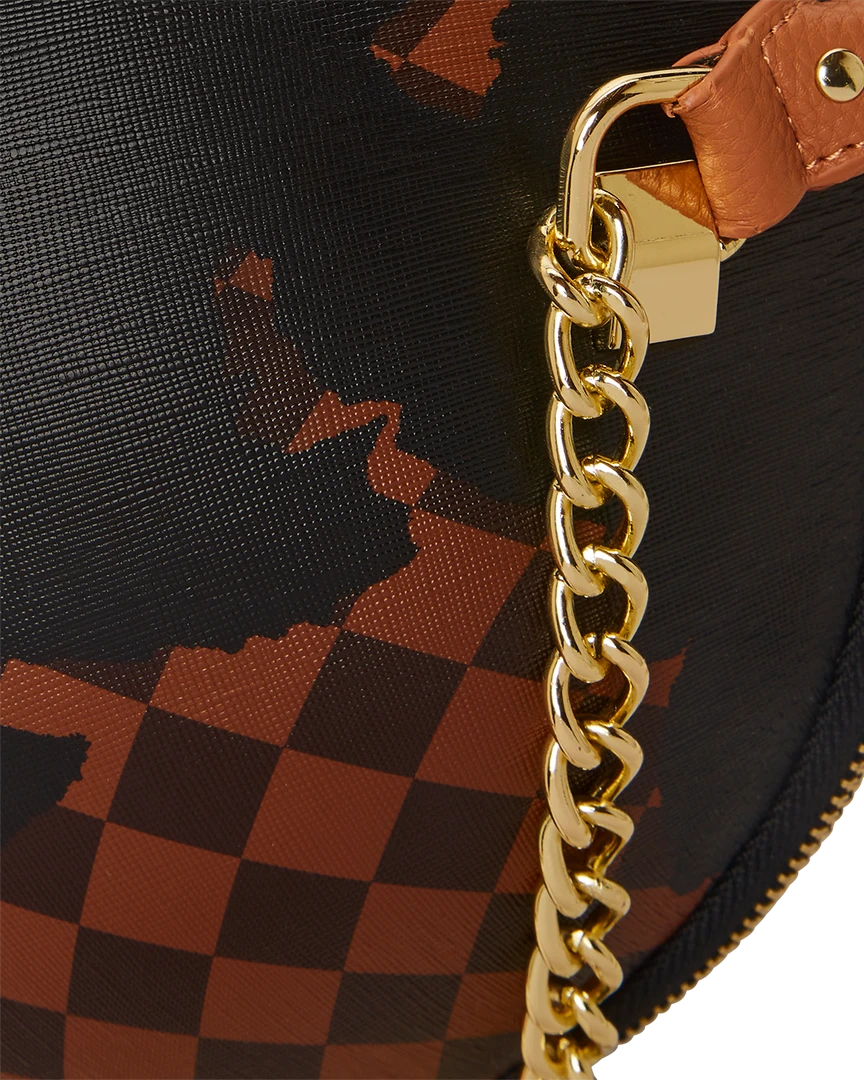 Whimsical sphere-shaped shoulder bag features sharks in Paris map printed in saffiano fabric with contrast cognac pebble fabric