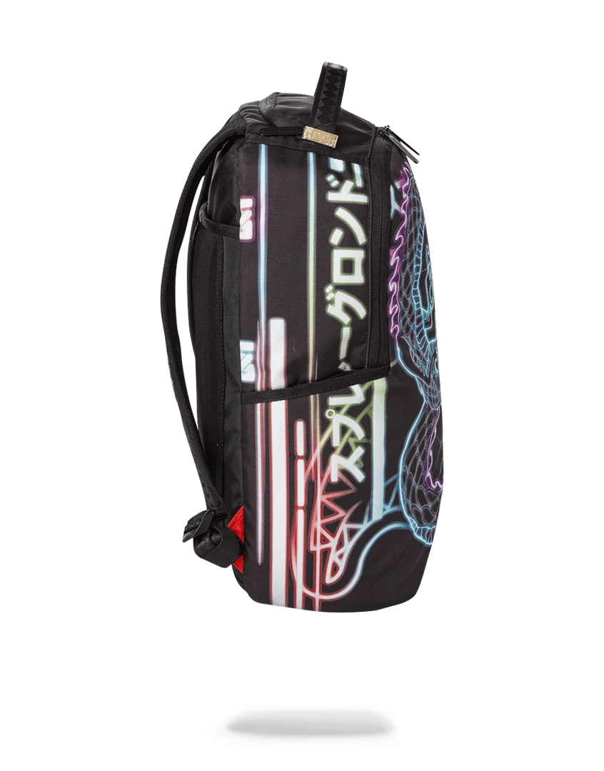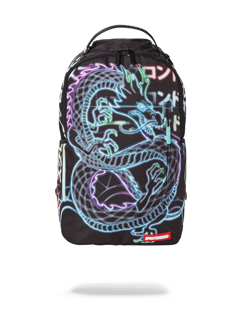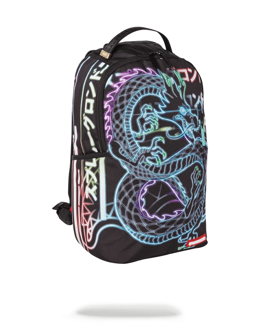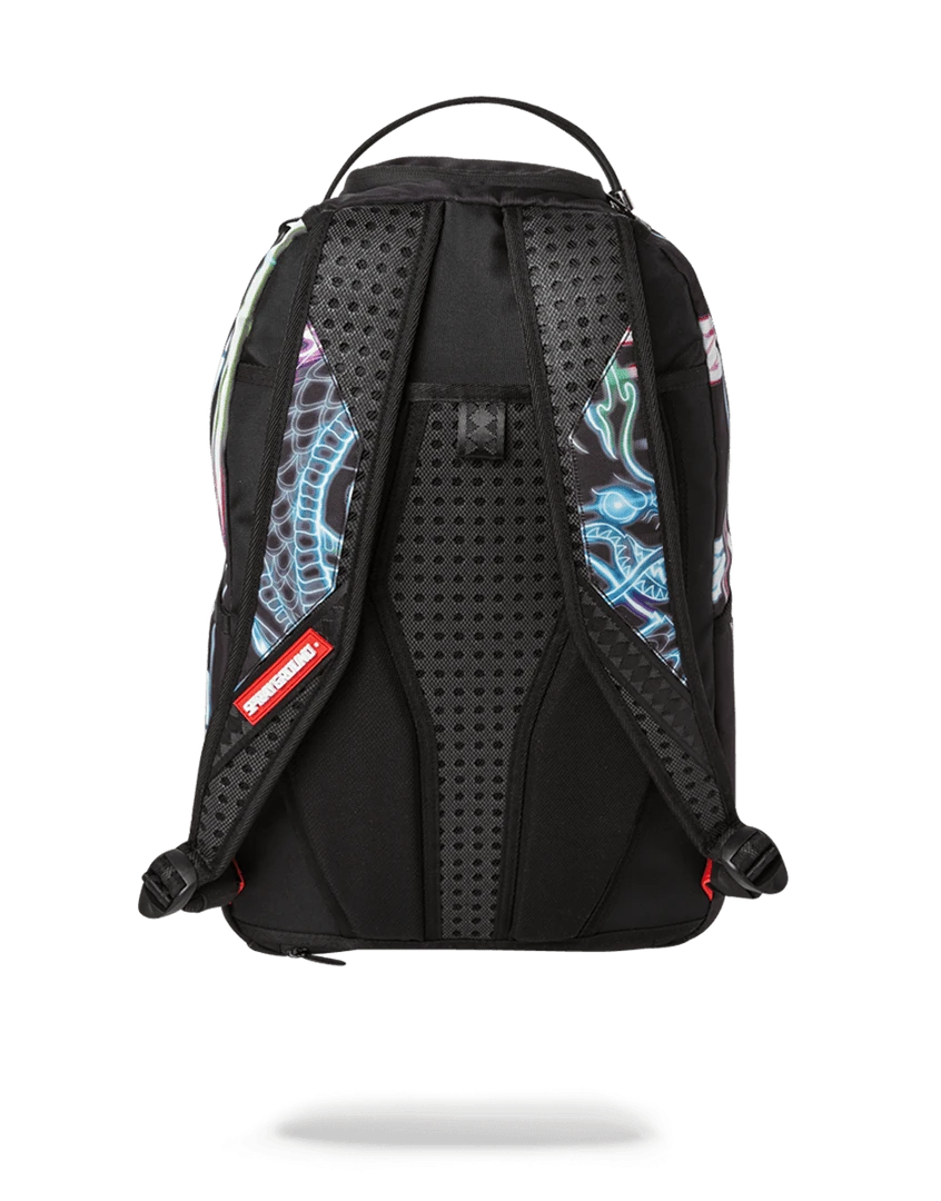 SPRAYGROUND 2077. The Neon Lights of Shark City Glow at Night with The New Limited Edition Crypto Stacks & Nite Dragon Backpacks, Luggage, Tote, Pouch & FaceMask. GLOWS NOW!