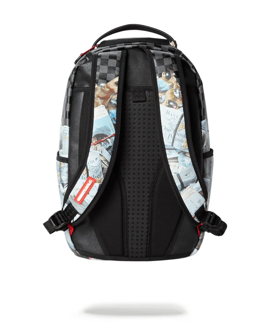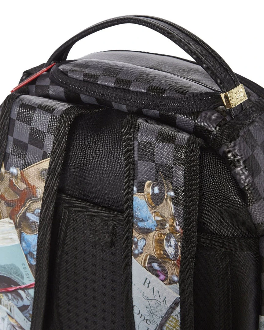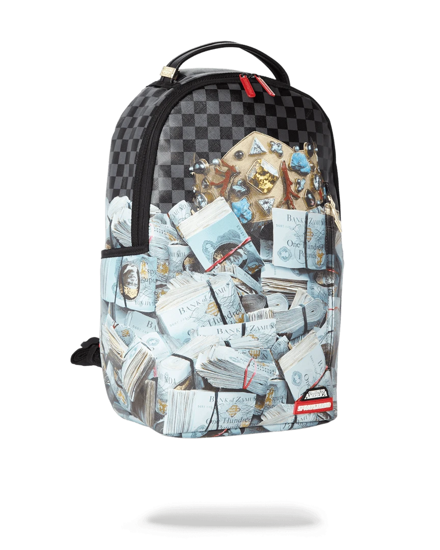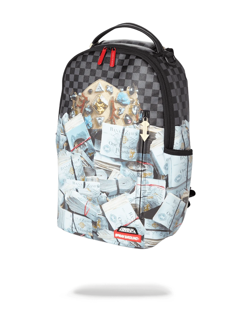 • Custom Gold King of Zamunda Pendant Zipper Pulley • Dimensions: 18″ x 6″ x 11.5″ •Front zipper pocket• Side pockets • Zippered Stash pocket • Ergonomic mesh back padding• Adjustable Straps for custom sizing • Nylon Zippers with Metal Hardware • Metal “Sprayground Authentic” badge •Slide through back sleeve connects to Carry on luggage to free your hands
