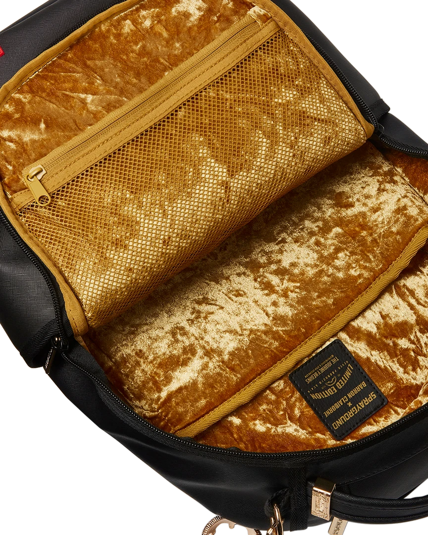 Dimensions: 18″ x 6″ x 11.5″ • Front zipper pocket • Side pockets • Zippered Stash pocket • Separate velour sunglass compartment • Ergonomic mesh back padding • Adjustable Straps for custom sizing • Gold zippers with metal hardware • Metal “Sprayground Authentic” badge • Slide through back sleeve connects to carry-on luggage to free your hands