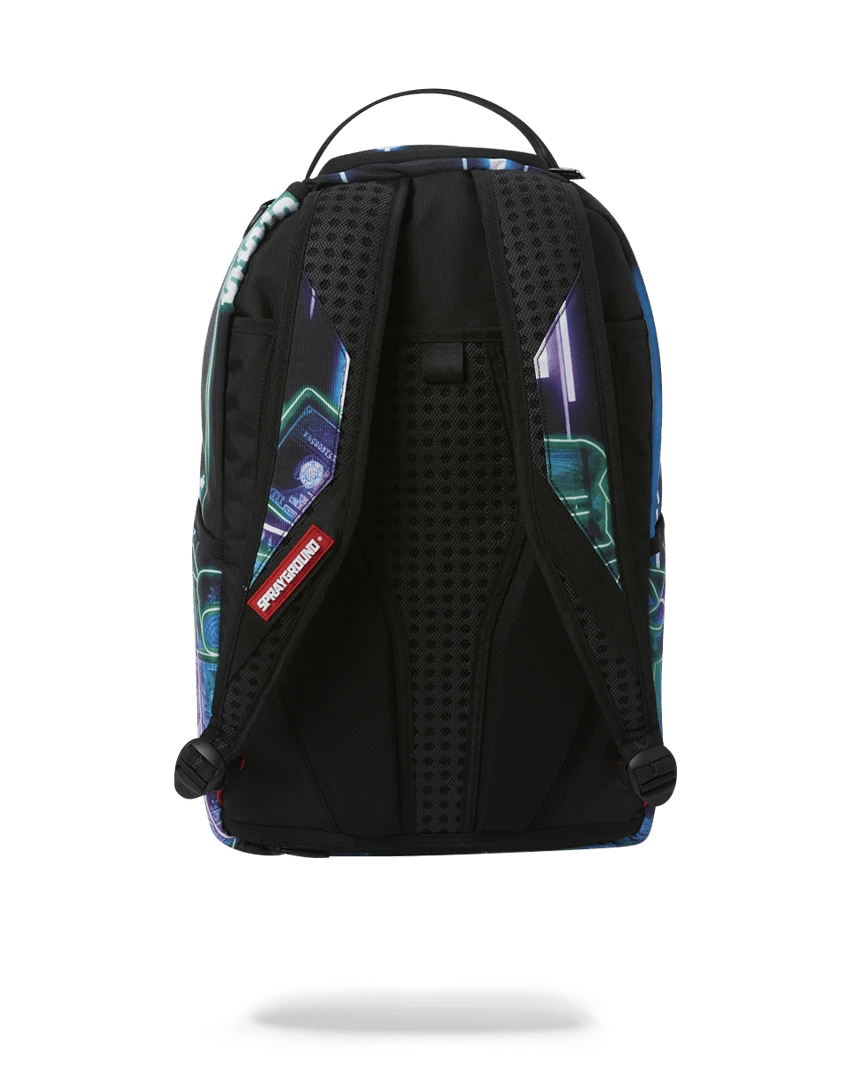SPRAYGROUND 2077. The Neon Lights of Shark City Glow at Night with The New Limited Edition Crypto Stacks & Nite Dragon Backpacks, Luggage, Tote, Pouch & FaceMask. GLOWS NOW!