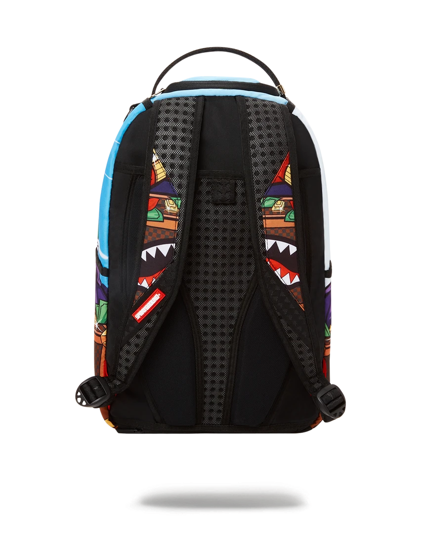 Dimensions: 18″ x 6″ x 11.5″ • Front zipper pocket • Side pockets • Zippered Stash pocket • Separate velour sunglass compartment • Ergonomic mesh back padding • Adjustable Straps for custom sizing • Green zippers with metal hardware • Metal “Sprayground Authentic” badge • Slide through back sleeve connects to carry on luggage to free your hands