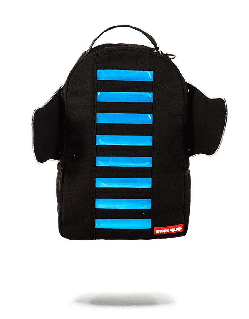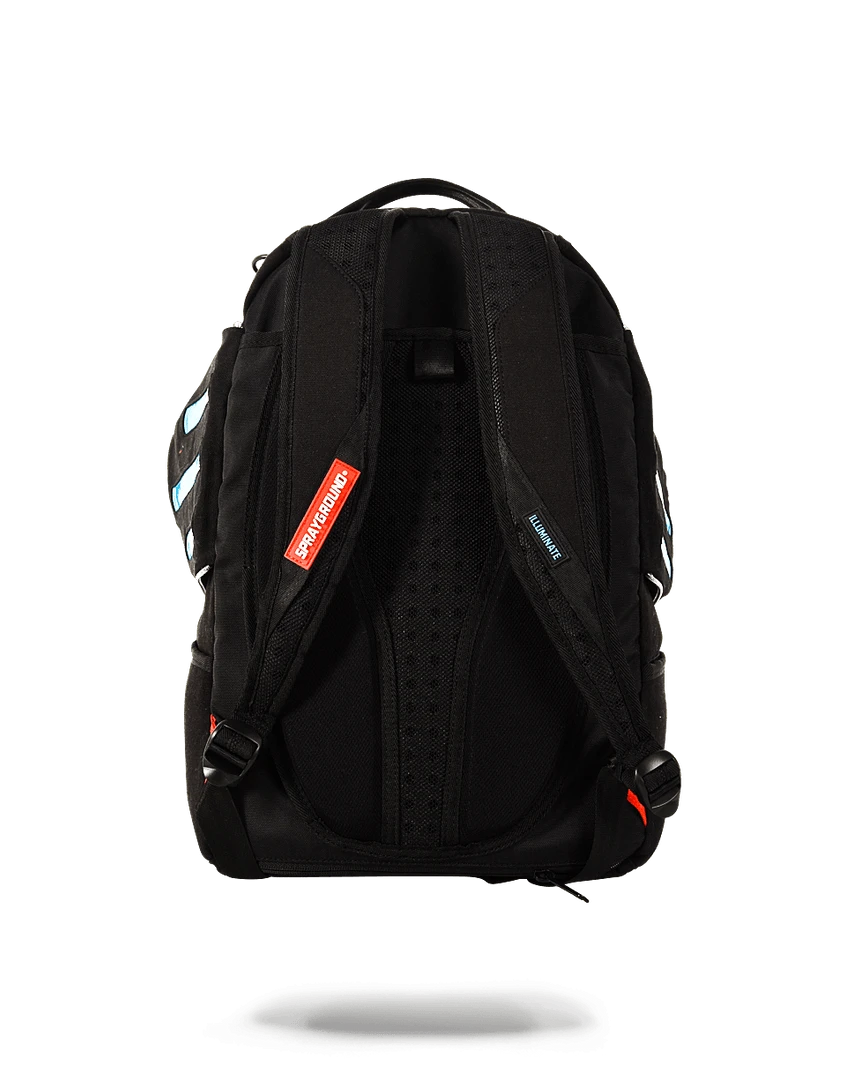 Dimensions: 18″ x 6″ x 11.5″ ∙ Front zipper pocket ∙ Side pockets ∙ Zippered Stash pocket ∙ Ergonomic mesh back padding ∙ Adjustable Straps for custom sizing ∙ Nylon Zippers with Metal Hardware ∙ Metal “Sprayground Authentic” badge ∙ Slide through back sleeve connects to Carry on luggage to free your hands ∙ LED Lights on the front and wings, activated by an “illuminate” button on the straps