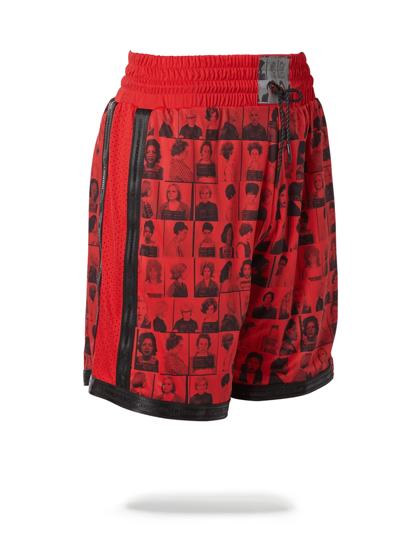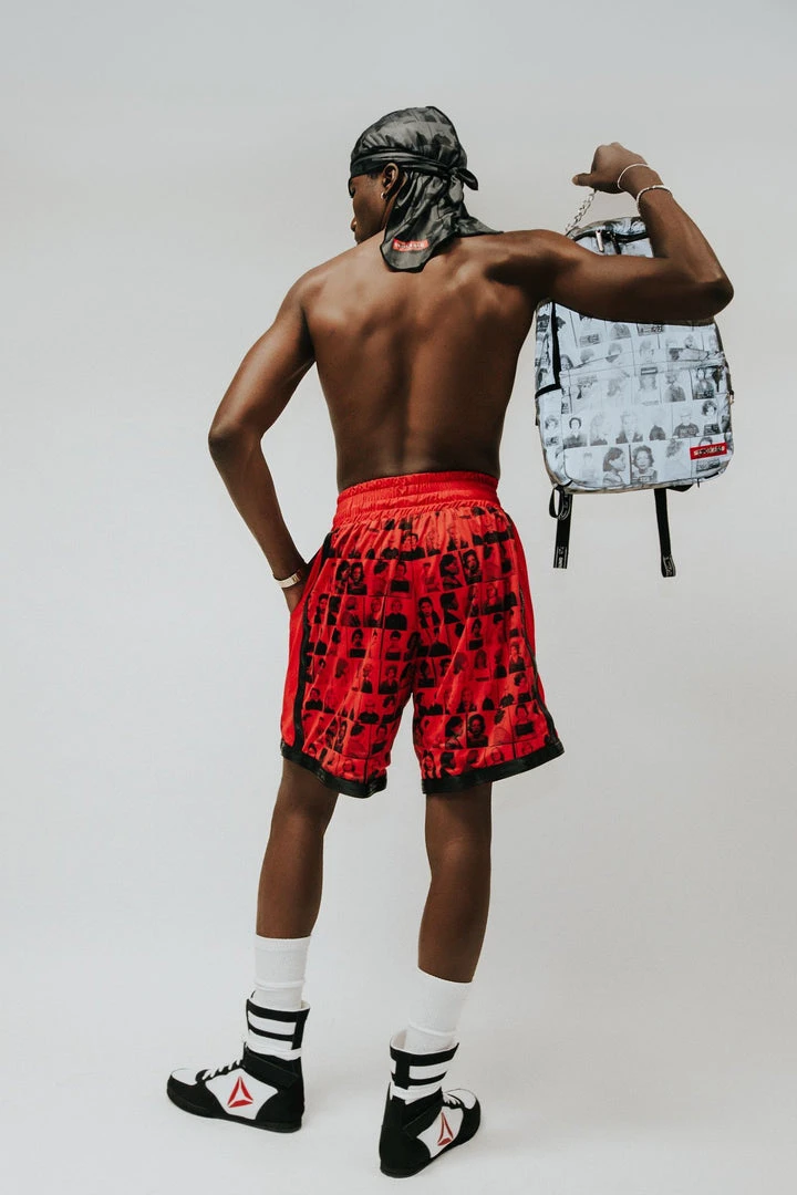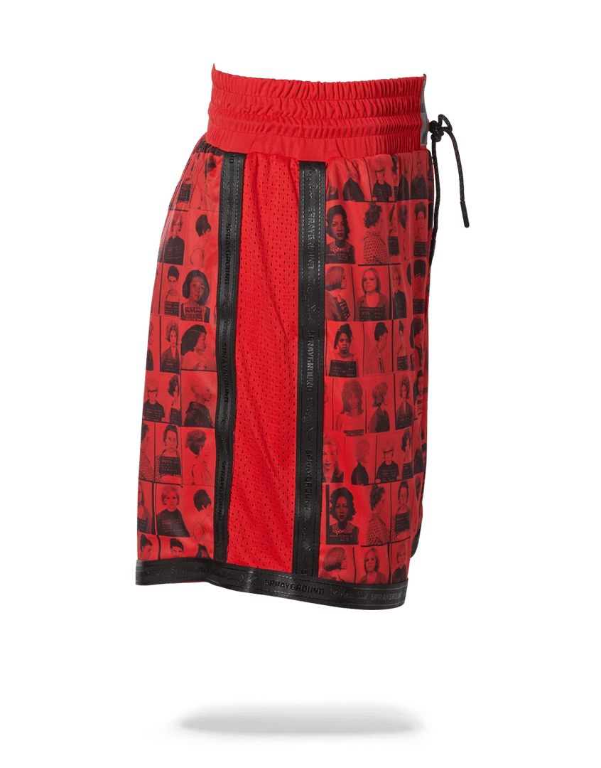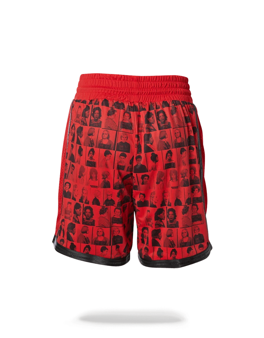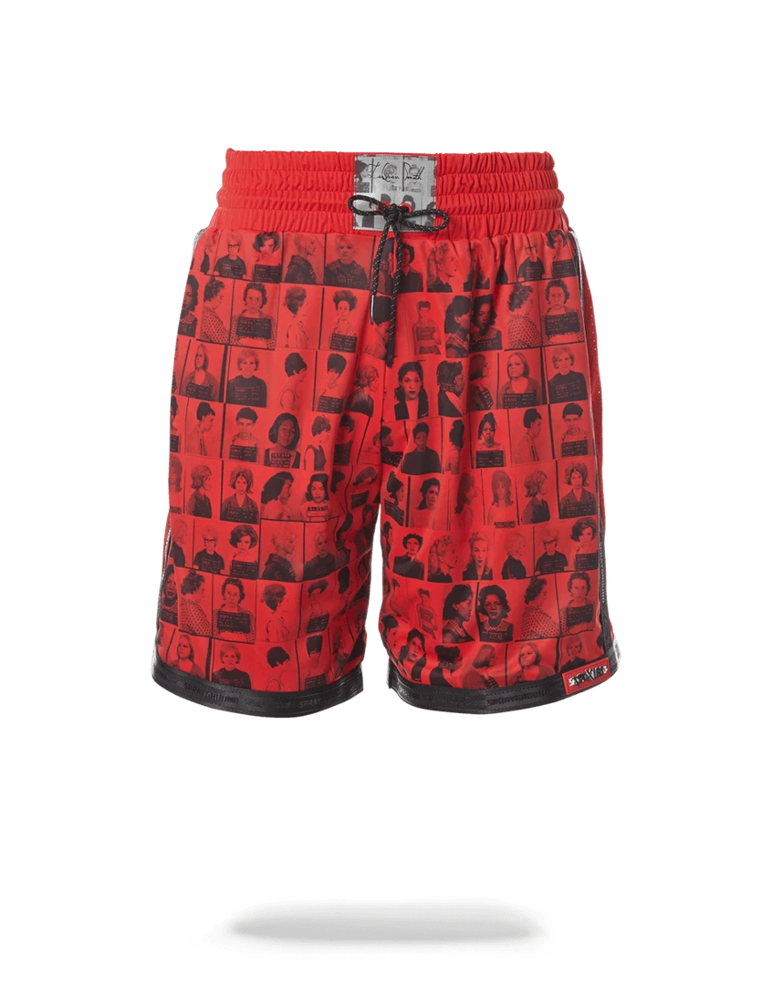Exclusive LQS x DBD collaboration from the Scammer Collection featuring printed mugshots of powerful women convicted for crimes throughout history. Has 3M centerpiece on waistband and black signatured trimming.