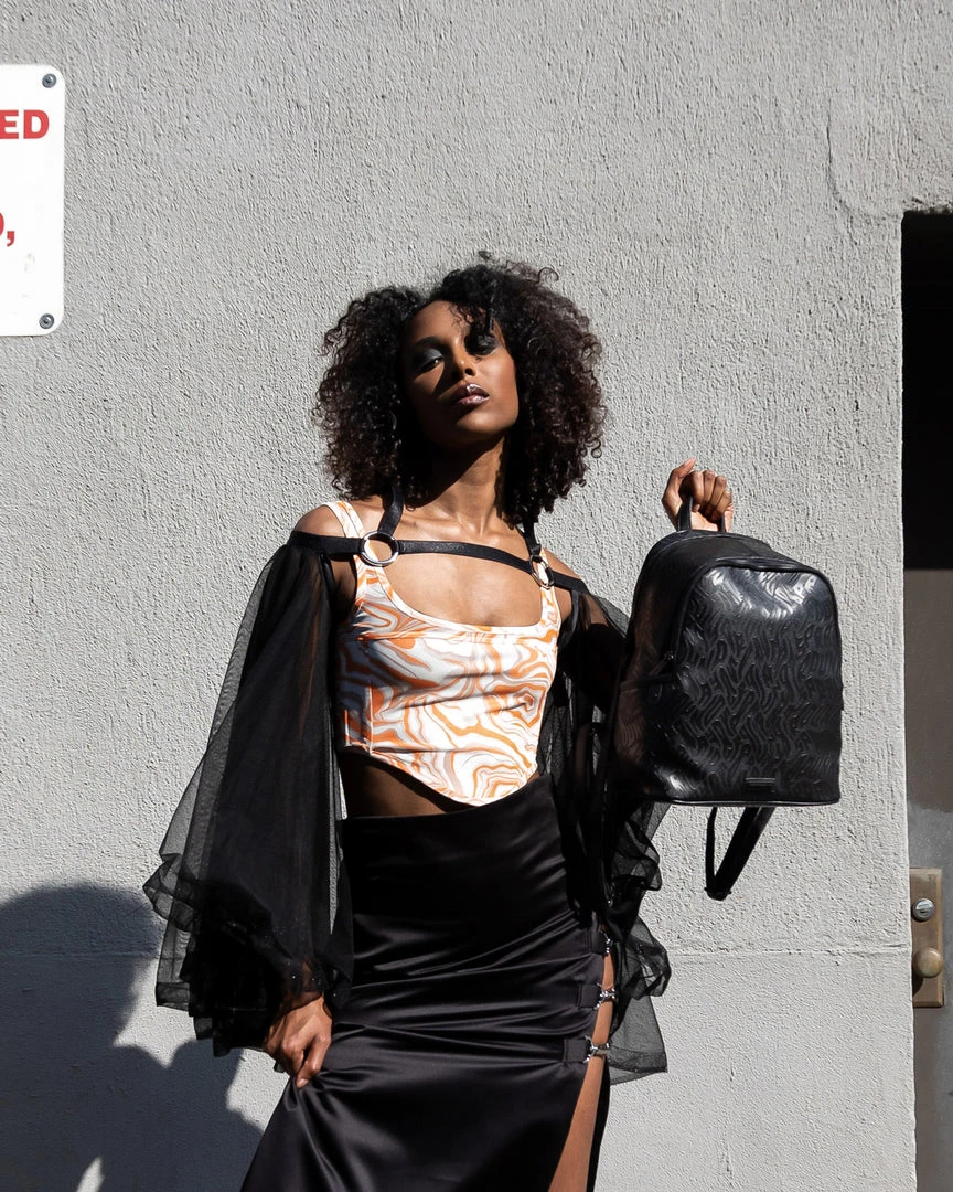 Dimensions: 10″ x 5″ x 11.5″ • Two large main zippered compartments • Side pockets • Zippered Stash pocket • Adjustable straps for custom sizing • Gold zippers with metal hardware