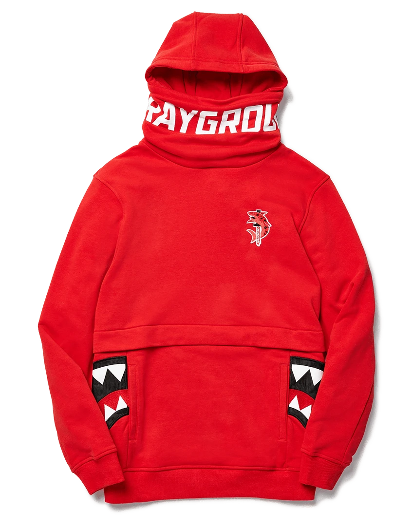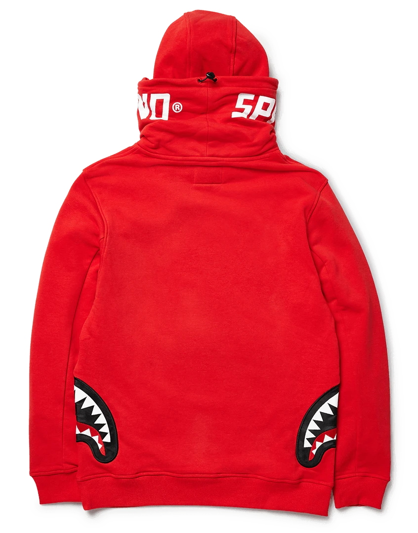 Exclusive and limited turtleneck sweatshirt hoodie with wrap-around logo. Hoodie is featured with shark applique on chest and shark mouth kangaroo pockets.