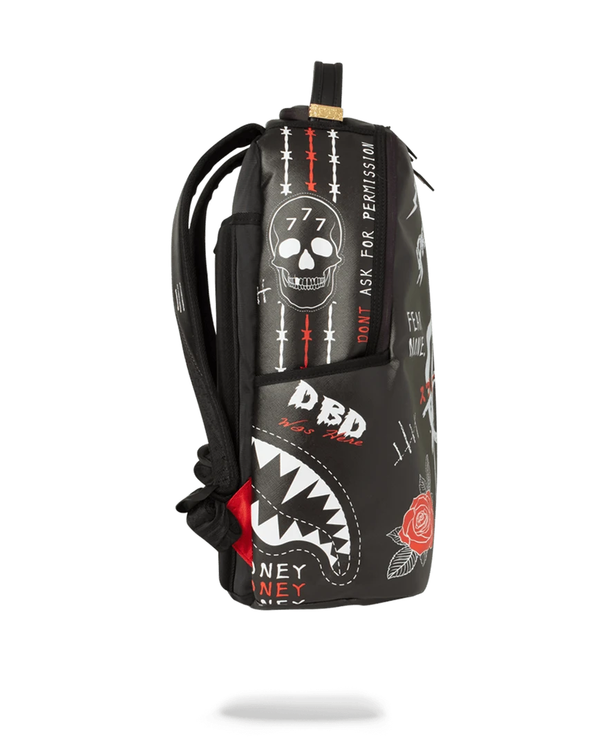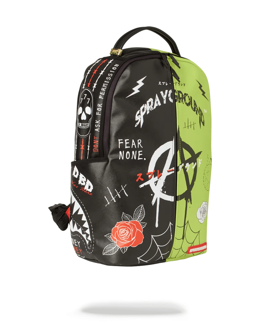 Dimensions: 18″ x 6″ x 11.5″ • Front zipper pocket • Side pockets • Zippered Stash pocket • Separate velour sunglass compartment • Ergonomic mesh back padding • Adjustable Straps for custom sizing • Black lightning bolt zippers with metal hardware • Metal “Sprayground Authentic” badge • Slide through back sleeve connects to carry-on luggage to free your hands