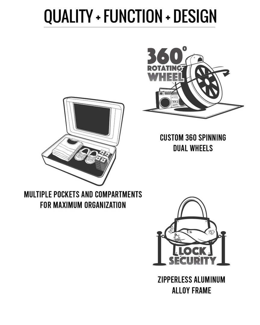 The Journey Begins…Our tough yet lightweight luggage collection is produced with quality, function, and design in mind. The 100% Polycarbonate constructed shell creates superior protection for all your travel goods, while the spacious interior is equipped with multiple pockets and compression straps to keep your items secure. To guarantee efficient navigation we have designed our luggage collection to be equipped with double spinner wheels to make your journey as smooth as possible. Other features include a 100% Aluminum frame equipped with 2 TSA Security Locks as well as a comfortable scope handle to navigate the luggage with ease.